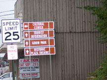 Official Tourism Brown Signs let people know the Cultural Center, Tourist Information, Gorin Park and Historic Plaza Theatre are ahead. NOTE: There needs to be a similar sign at the Hwy 31E/90 Intersection that also directs people to historic downtown.