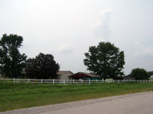 White barn set back from road