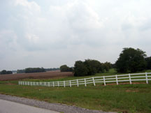 More fields with a white fence lining the road and a tree line of hardwoods behind the fields