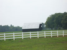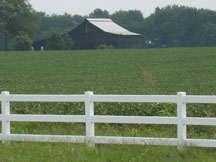 Cornfield with white fence and barn