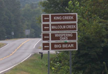 Official brown signs directing visitors to turn onto Hwy 1462 to King Creek, Malcolm Creek, Whispering Oaks and Big Bear