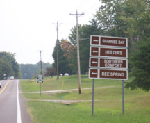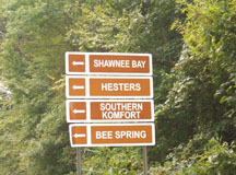 Brown Signs directing visitors to turn onto Hwy 962 to: Shawnee Bay, Hesters, Southern Komfort, Bee Spring