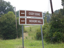 Brown official signs directing visitors to turn off Hwy 68 to get to Cozy Cove and Hickory Hill